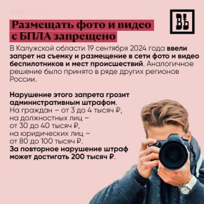 В Калужской области продолжает действовать запрет на публикацию в соцсетях и мессенджерах фото и видео беспилотников, данных об их маршрутах, точках запуска или падения, а также фото и какие-либо сведения о последствиях атак, напомнили в пресс-службе...