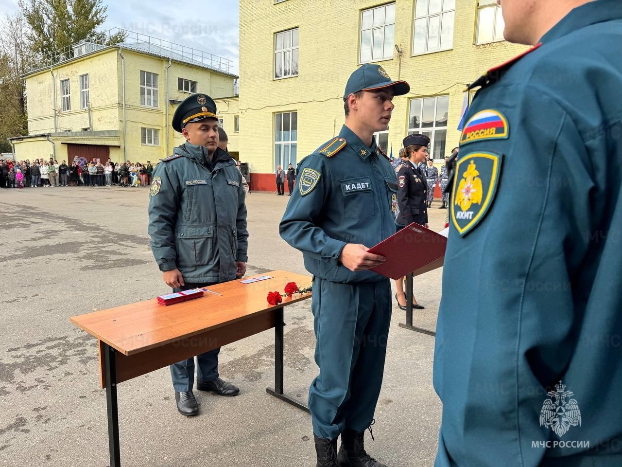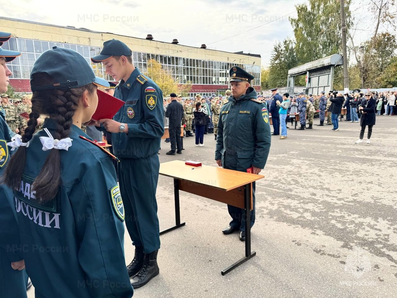 Военнослужащие и сотрудники управления гражданской обороны и защиты населения подполковник Макаров Артем Игоревич и старший лейтенант внутренней службы Алексей Радисович Батталов приняли участие в принятии торжественной Клятвы кадетов калужского кадетского многопрофильного техникума им. А.Т. Карпова.