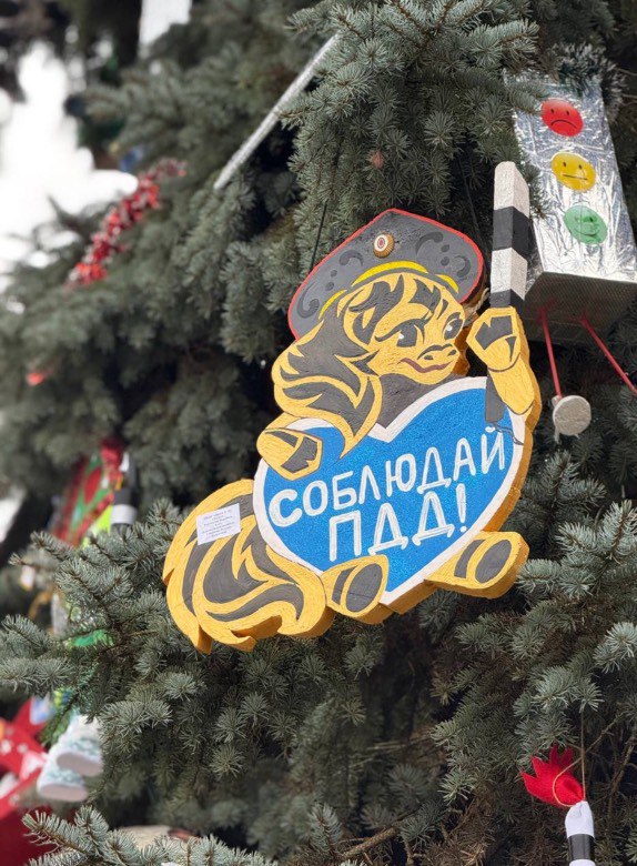 Праздничное дерево украшено новогодними игрушками, изготовленными юными участниками конкурса «Елочка ГАИ».