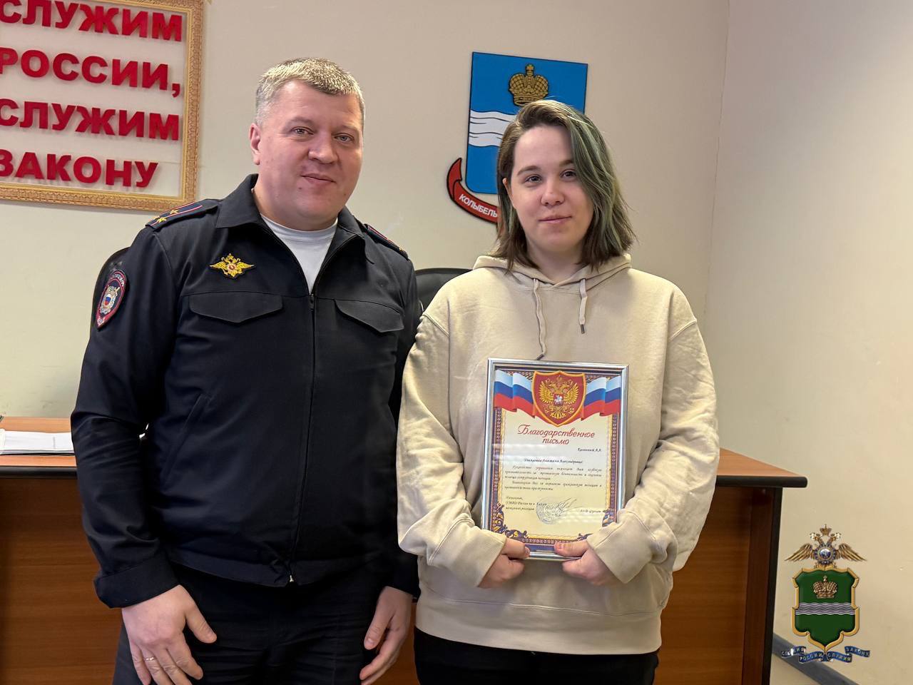 Руководитель УМВД России по городу Калуге Юрий Фролов поблагодарил калужанку за ее активную гражданскую позицию и вручил ей благодарственное письмо и ценный подарок
