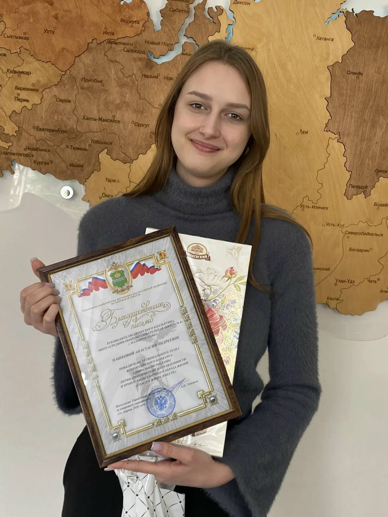 Руководитель авторского коллектива школы № 4 г. Малоярославца Анастасия Пашкова получила Благодарственное письмо начальника Управления по контролю за оборотом наркотиков УМВД России по Калужской области, за победу в региональном этапе Всероссийского конкурса социальной рекламы «Спасем жизнь вместе».