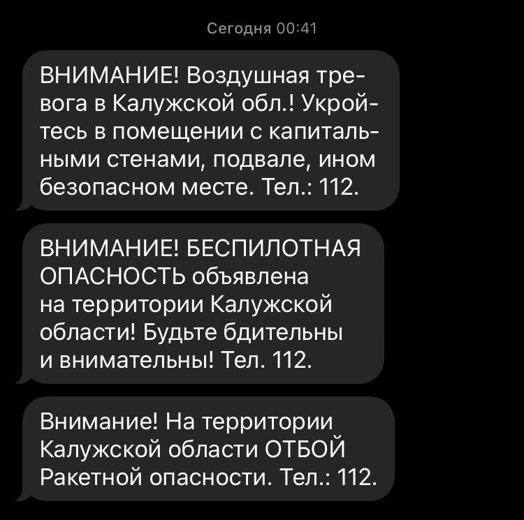 Соответствующие сообщения приходили жителям региона от МЧС.Около 1:30 калужанам одновременно разослали сообщение об отмене ракетной опасности и про объявление беспилотной опасности.А около 6:30 МЧС сняло беспилотную...