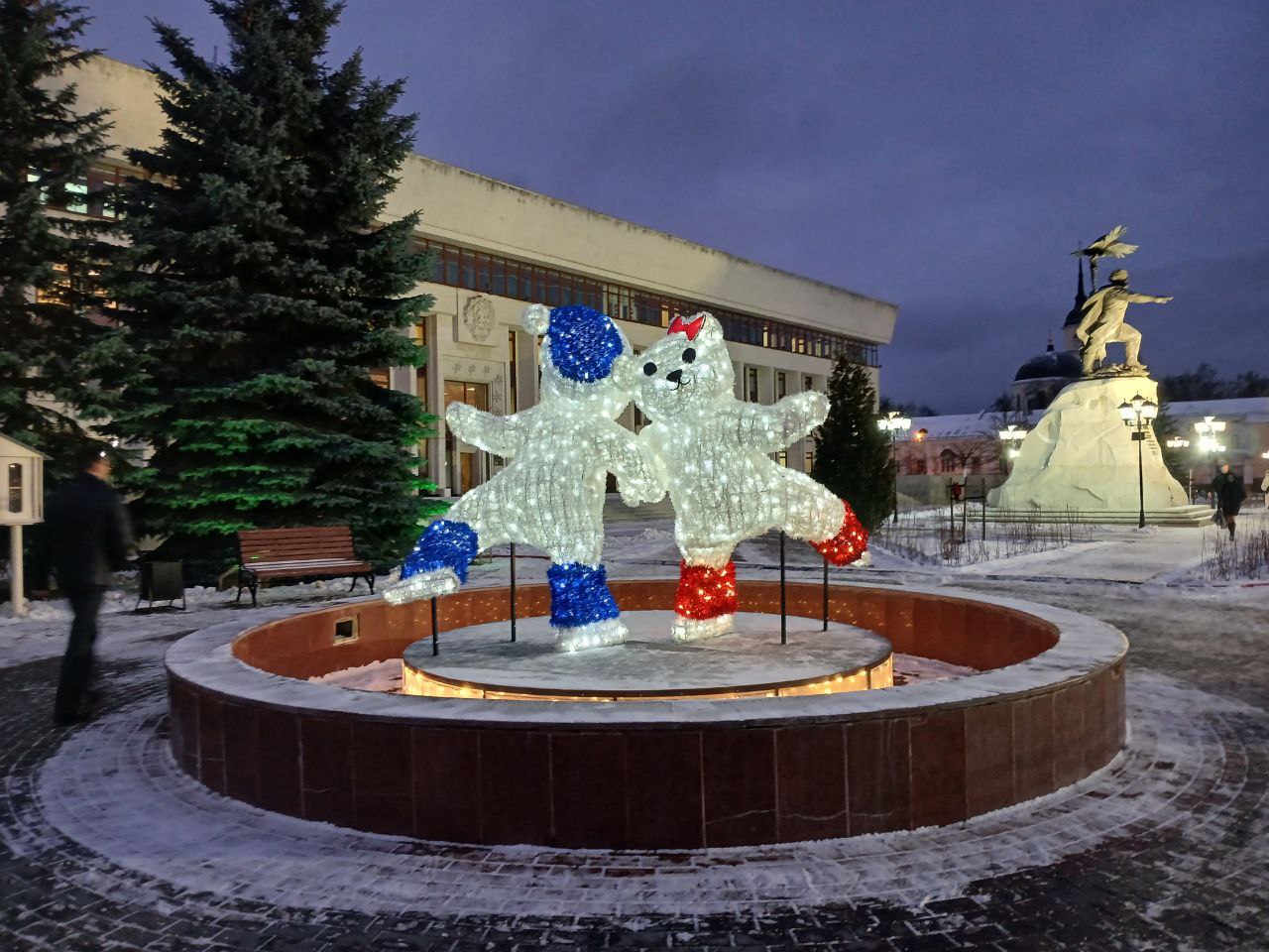 В центре Калуги появились новые праздничные инсталляции. На площади Старый Торг рядом с катком, который пока ещё закрыт, установили две светящиеся фигуры - медведей на коньках.