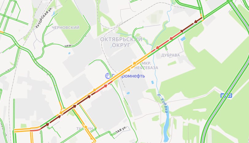 Точных данных о причинах затора пока нет. По одной из версий, закрыто движение через железнодорожный переезд в районе нефтебазы.