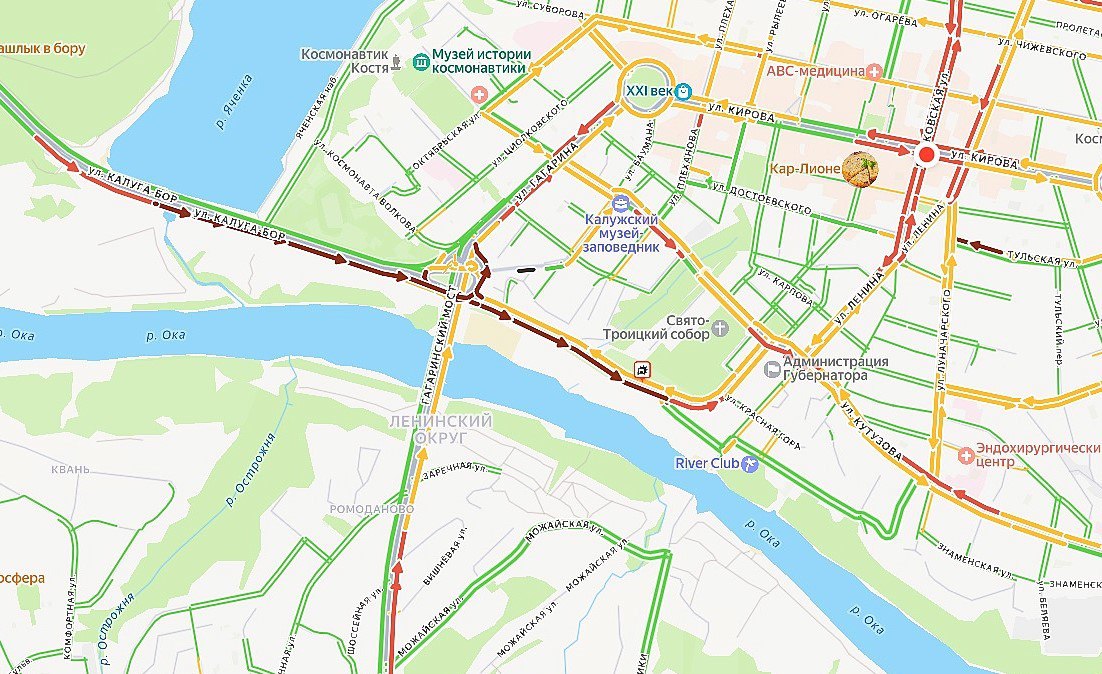 Наиболее серьёзная пробка возникла на улице Набережная в сторону Старого торга. ДТП в правом ряду привело к образованию затора протяжённостью в три километра от калужского Бора.