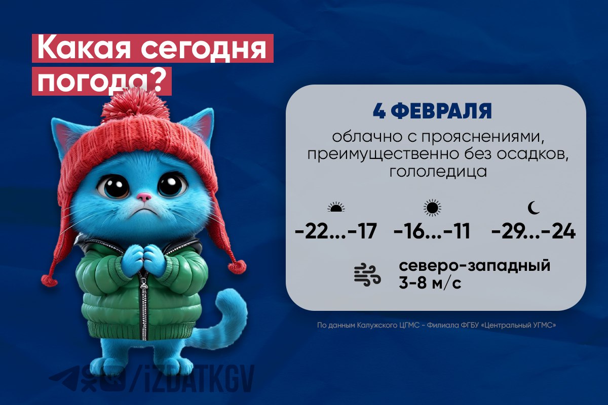 Синоптики сообщили, что в ближайшие сутки в Калужской области не ожидается потепления. По прогнозу на 4 февраля, погода будет облачной с отдельными прояснениями, а осадков не предвидится. Утром температура воздуха составит около 25 градусов ниже нуля...