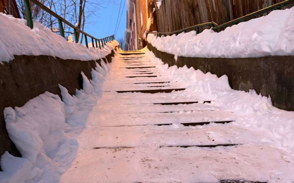 - Вымученная лестница на улице Детей Коммунаров, по которой ежедневно туда и обратно ходят дети в лицей имени Циолковского. Туда держась за ледяные перила, обратно верхом на рюкзаке, дабы не сломать ноги. Чистят её только после того, как пишем на вашу страницу! Ходить по ней невозможно! Пожалуйста, хотя бы с какой-нибудь периодичностью можно чистить лестницу? Или ждём несчастного случая.