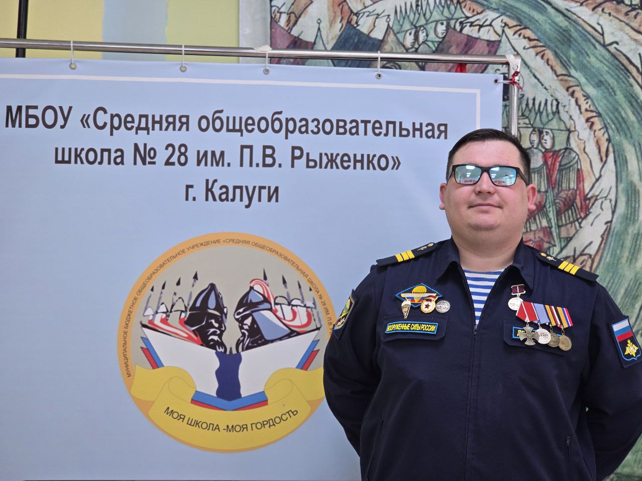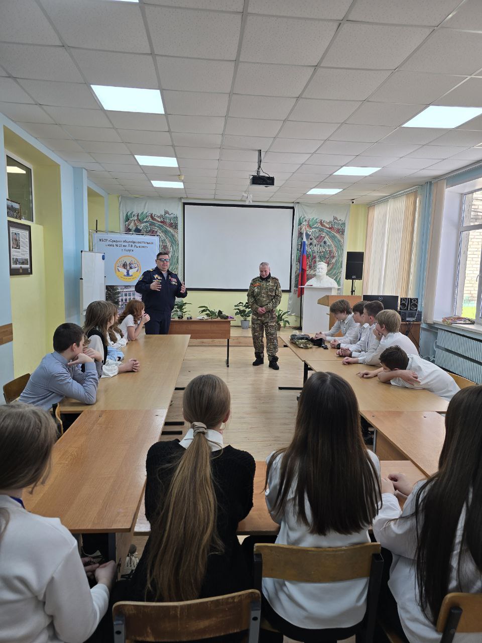 Ветеран СВО Анатолий Девушкин провел урок мужества в родной калужской школе № 28. Вместе с Анатолием на встречу с учащимися пришел его товарищ, калужанин Владимир Никитин, также участник спецоперации.