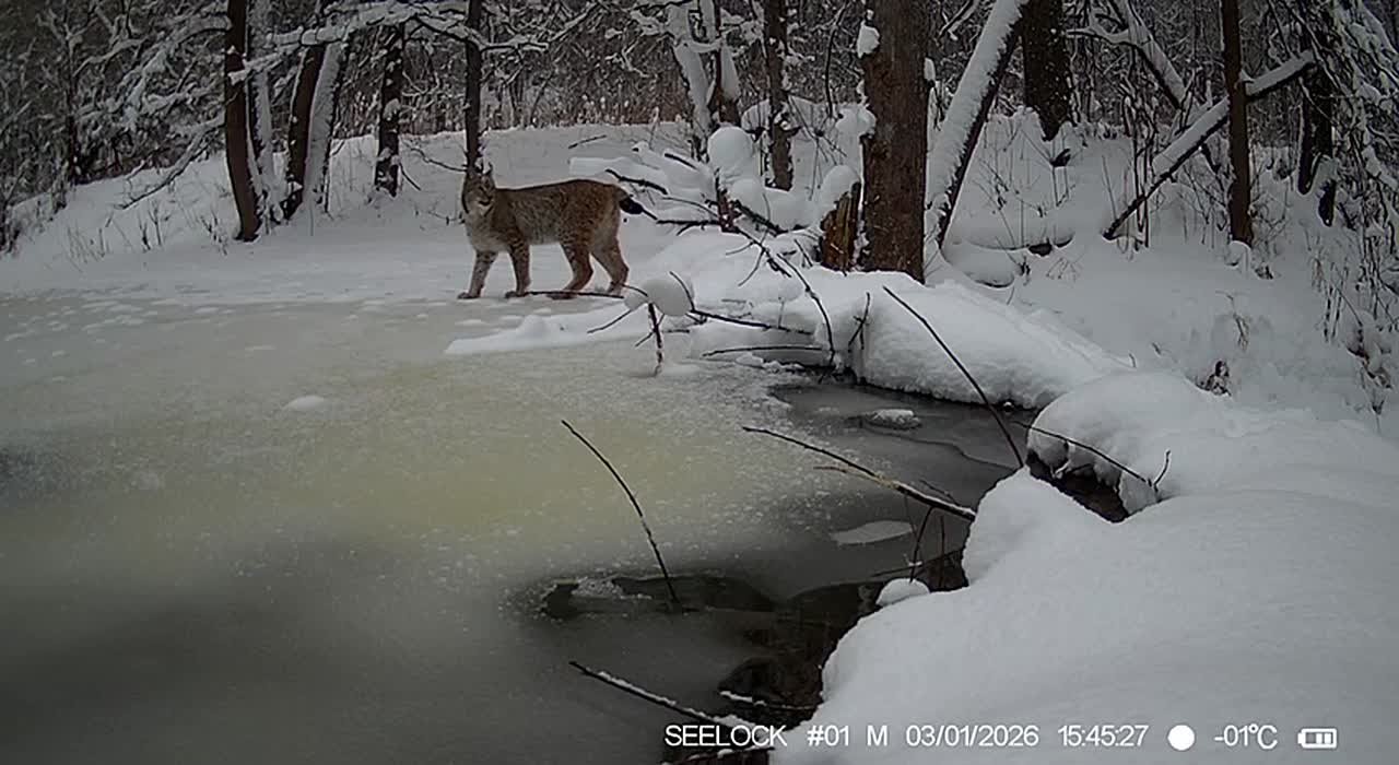 Животное обходило свои владения и вышло к бобровой плотине. Рысь запечатлела фотоловушка «Калужских засек»