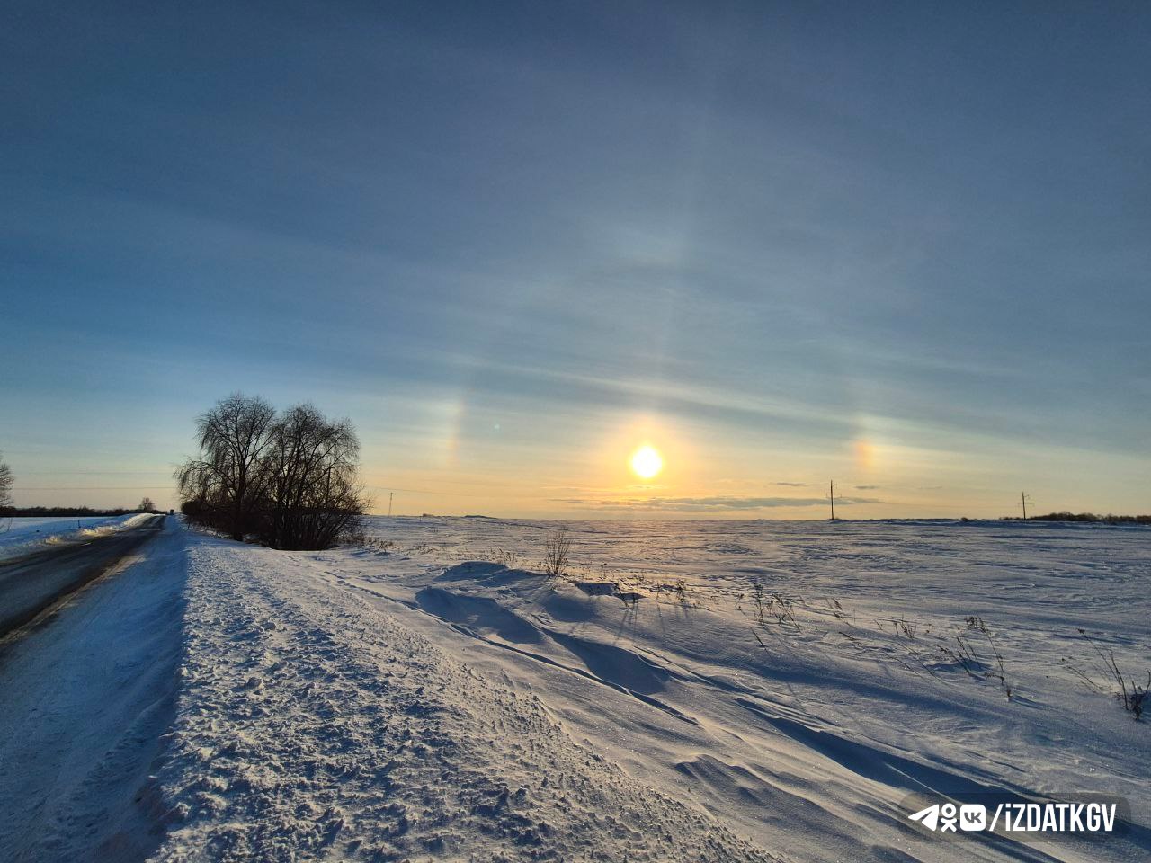 Солнечное гало в селе Гремячево Перемышльского округа. Кадр сделан 23 февраля. Автор фото: Виктория Андропова.