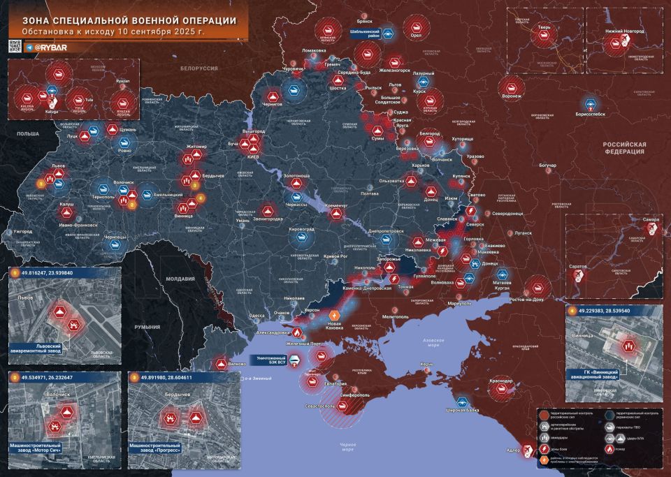 за 10 сентября 2025 годаРоссийские войска нанесли очередной комбинированный удар по объектам промышленности в западных регионах т.н. Украины. Противник атаковал дронами Ростовскую, Белгородскую и Калужскую области.На Лиманском направлении российские...