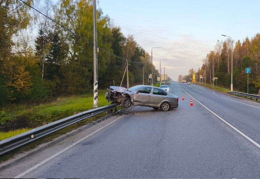 Skoda запрыгнула на отбойник после ДТП на трассе А130