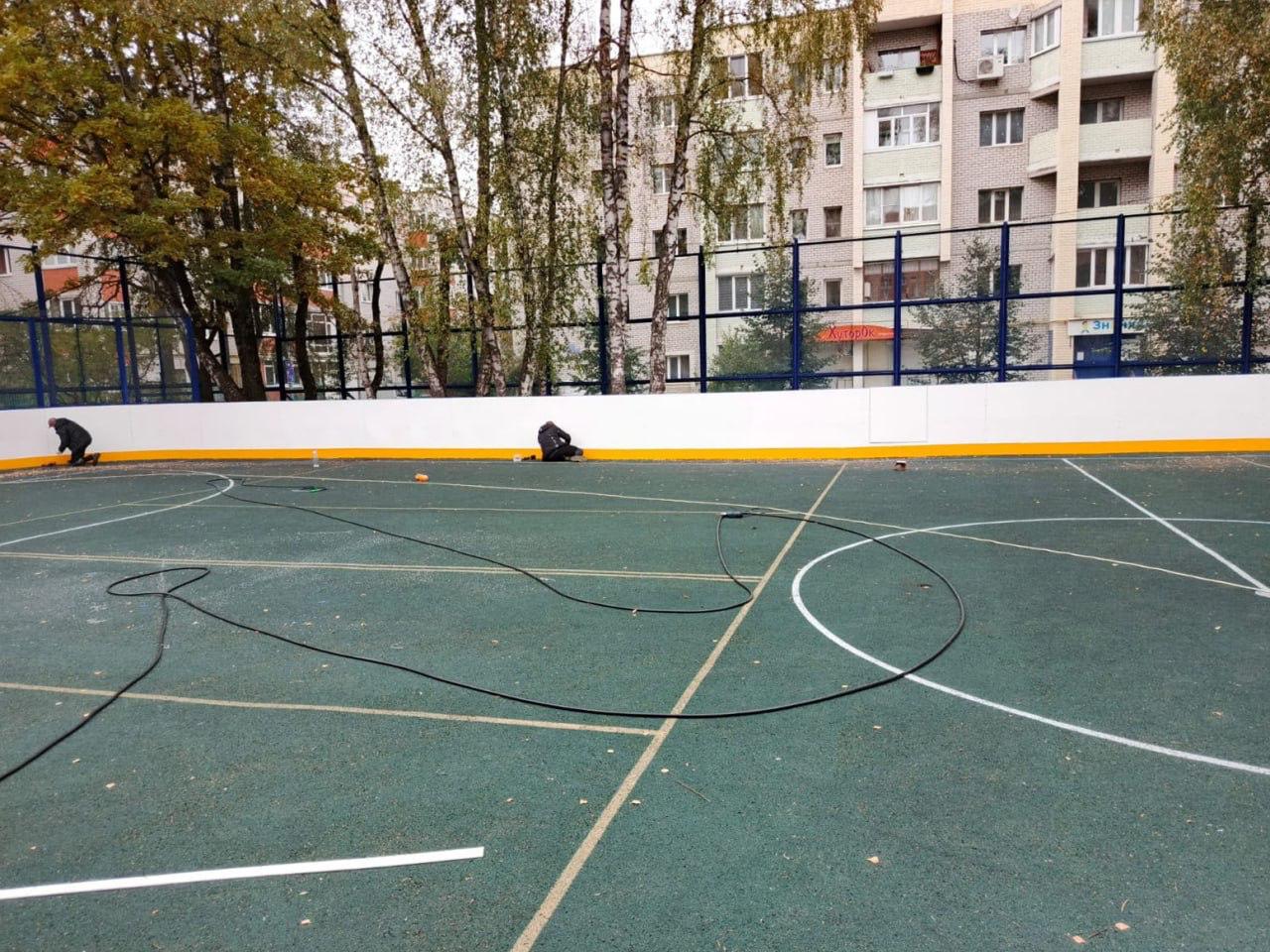 На обветшалой хоккейной коробке заменили резиновое покрытие, установили новые борта, осталось доделать желтую отбойную полосу вдоль нижней части.