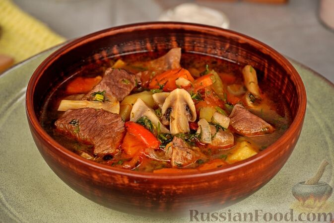- Суп-жаркое с говядиной и грибами: Этот суп удивляет своей насыщенной текстурой и ярким вкусом, благодаря обжарке мяса с овощами и специями.
