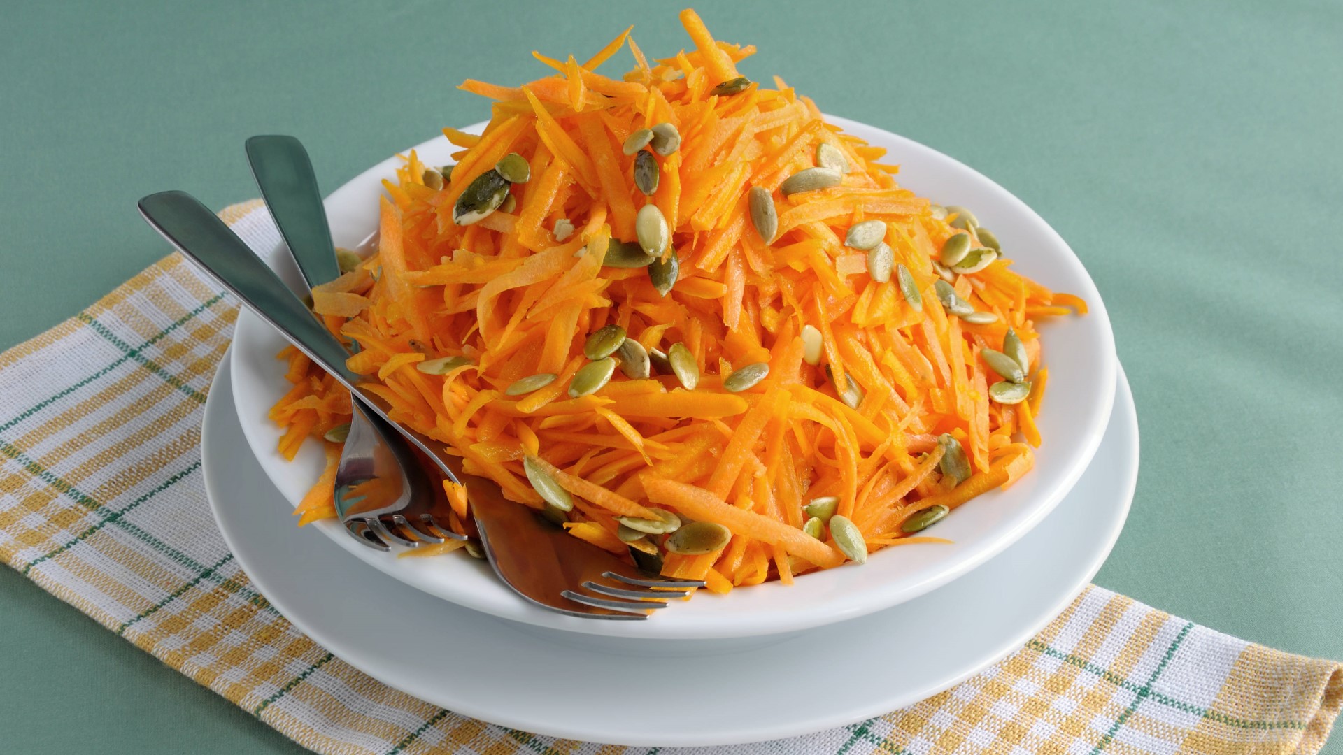 Соедините тыкву и морковь, заправьте салат растительным маслом и солью. Тщательно перемешайте блюдо и посыпьте семечками, советует портал «Гастрономъ». Готово! Можно подавать к столу.