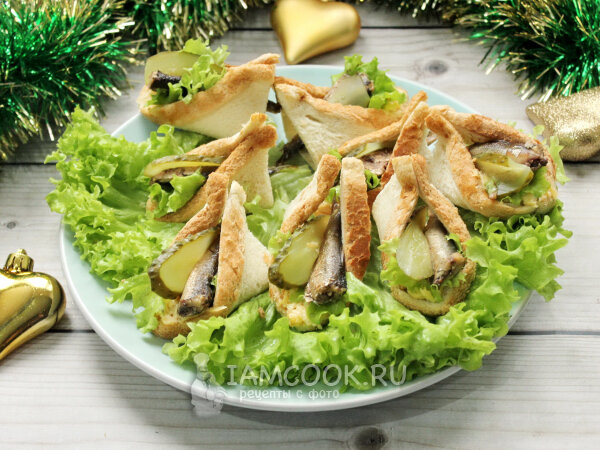 - Классические бутерброды со шпротами: на тостах с майонезом, огурцом и твердым сыром с добавлением чеснока — простая, но очень вкусная закуска.