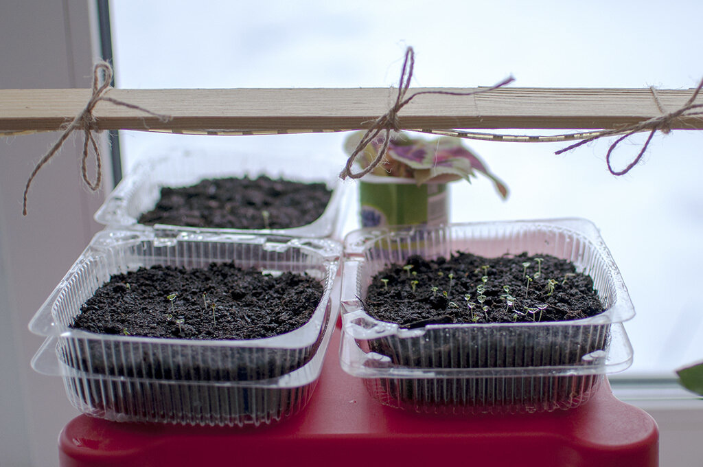 Когда рассада уже успела взойти, необходимо было найти способ разместить фитоленту так, чтобы она могла осветить растения наиболее эффективно. В итоге была собрана конструкция из подручных материалов. Значительное внимание уделялось тому, чтобы создание было быстрым и функциональным.