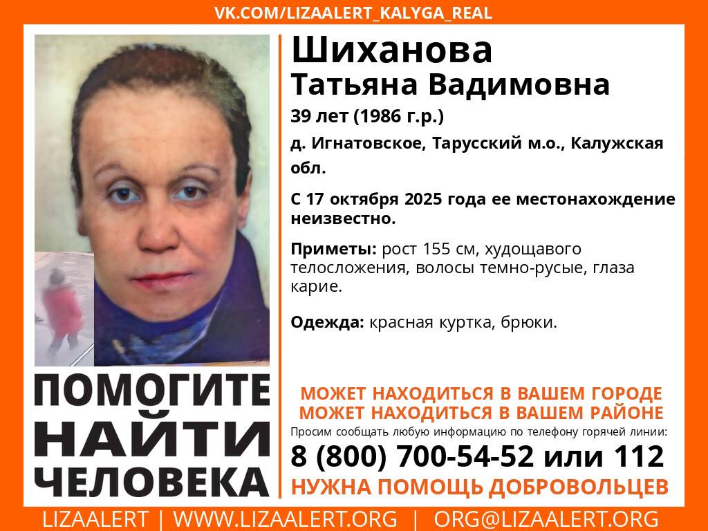 Поисково-спасательный отряд «ЛизаАлерт» объявил о поиске Шихановой Татьяны Вадимовны, 39 лет, д. Игнатовское, Тарусский район.