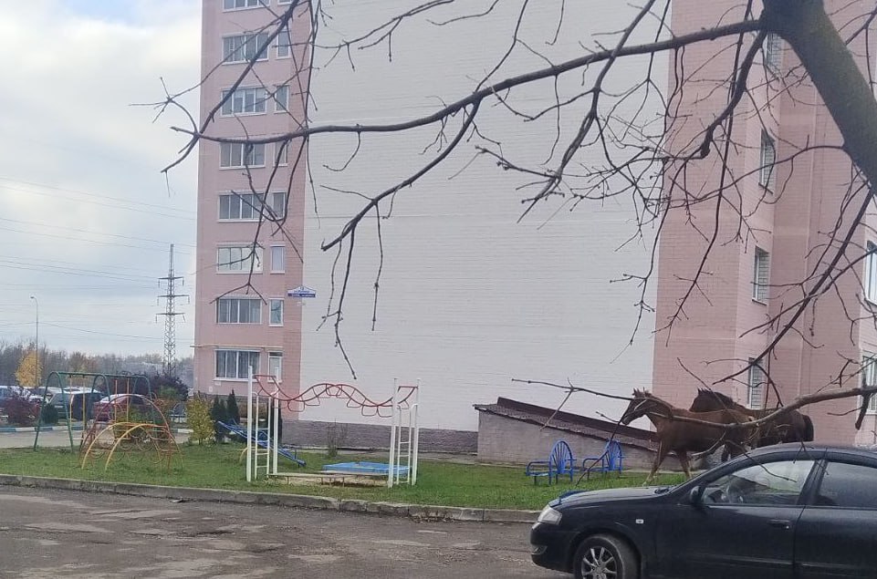 В калужском микрорайоне Кубяка лошади и коровы пасутся на детской площадке