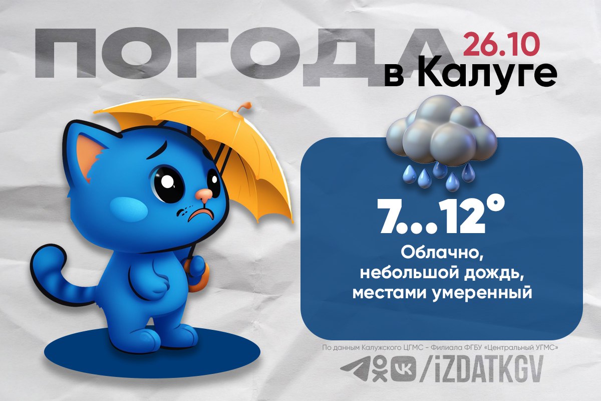 Сегодня в Калуге и области — облачно, небольшой дождь, местами умеренный. Ветер юго-восточный 7-12 м/с.