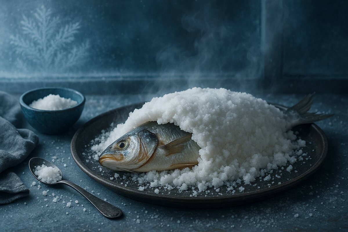Приготовление рыбы под снегом начинается с очистки и нарезки продукта. Рыба должна сохранять свою кожу, чтобы не потерять сочность. Далее смешивается соль с водой (или снегом), создавая кристаллическую массу, которая затем покрывает рыбу и лук в специальной форме. Блюдо запекается в разогретой духовке около 35-40 минут, что позволяет рыбе оставаться мягкой и ароматной.