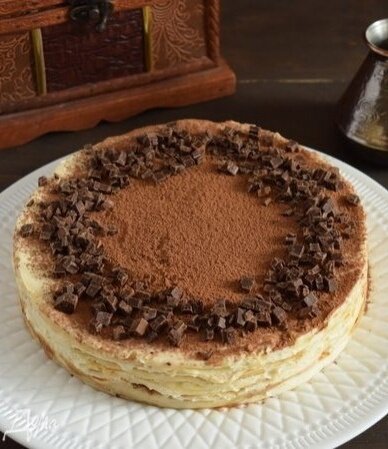 Готовый блинный торт убирается в холодильник на 2 часа. Перед подачей нарезанный шоколад в качестве украшения и посыпка какао из ситечка добавят завершающий штрих. К этому десерту хорошо подать чашечку свежезаваренного кофе, чтобы насладиться гармонией вкусов.