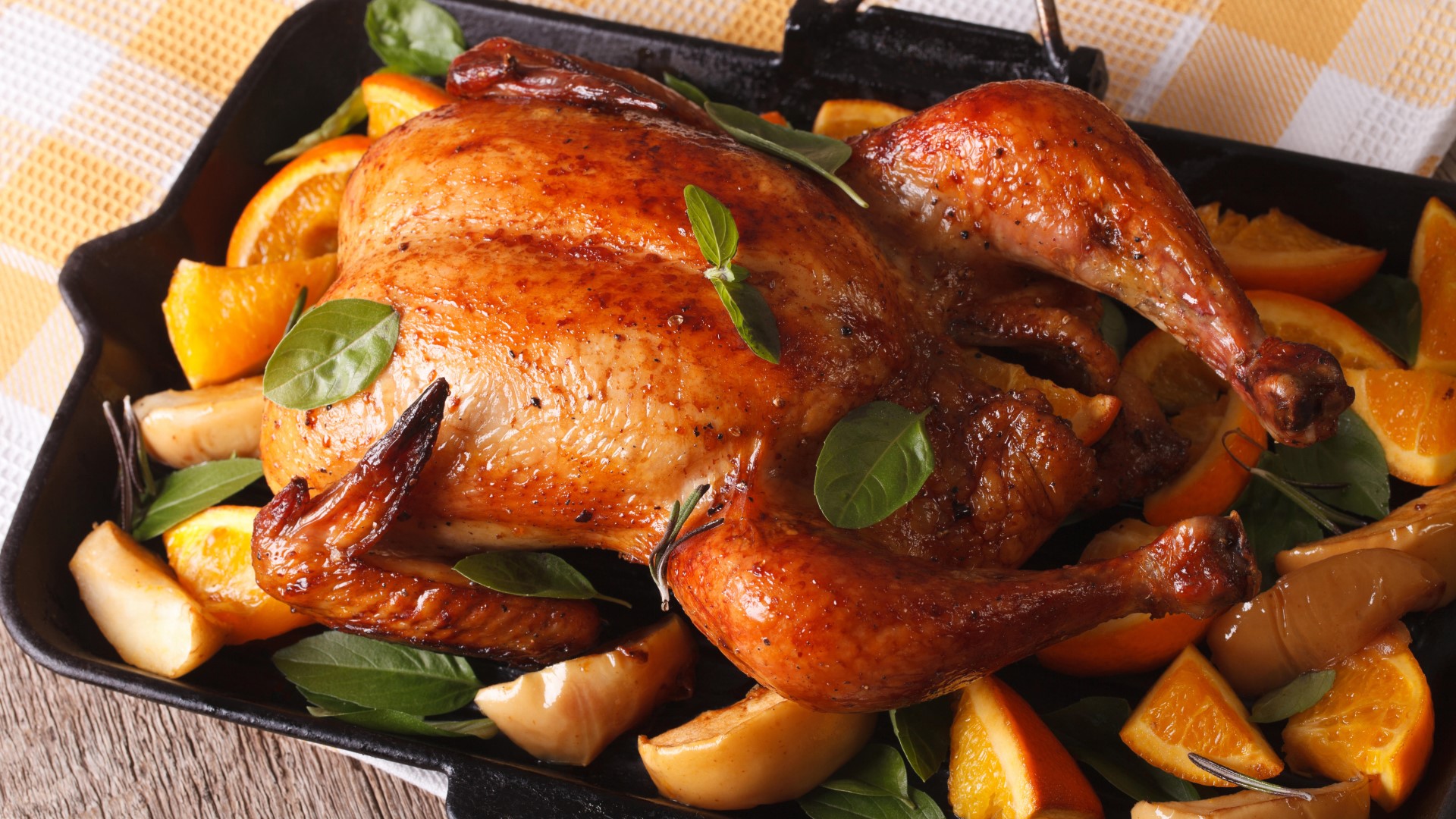 Апельсины нарежьте тонкими кружочками. Часть фруктов засуньте под кожу курицы, остальное — положите внутрь тушки. Зашейте кулинарными нитками или скрепите зубочистками, чтобы начинка не вывалилась. Теперь можно отправлять блюдо в разогретую до 220 градусов духовку.
