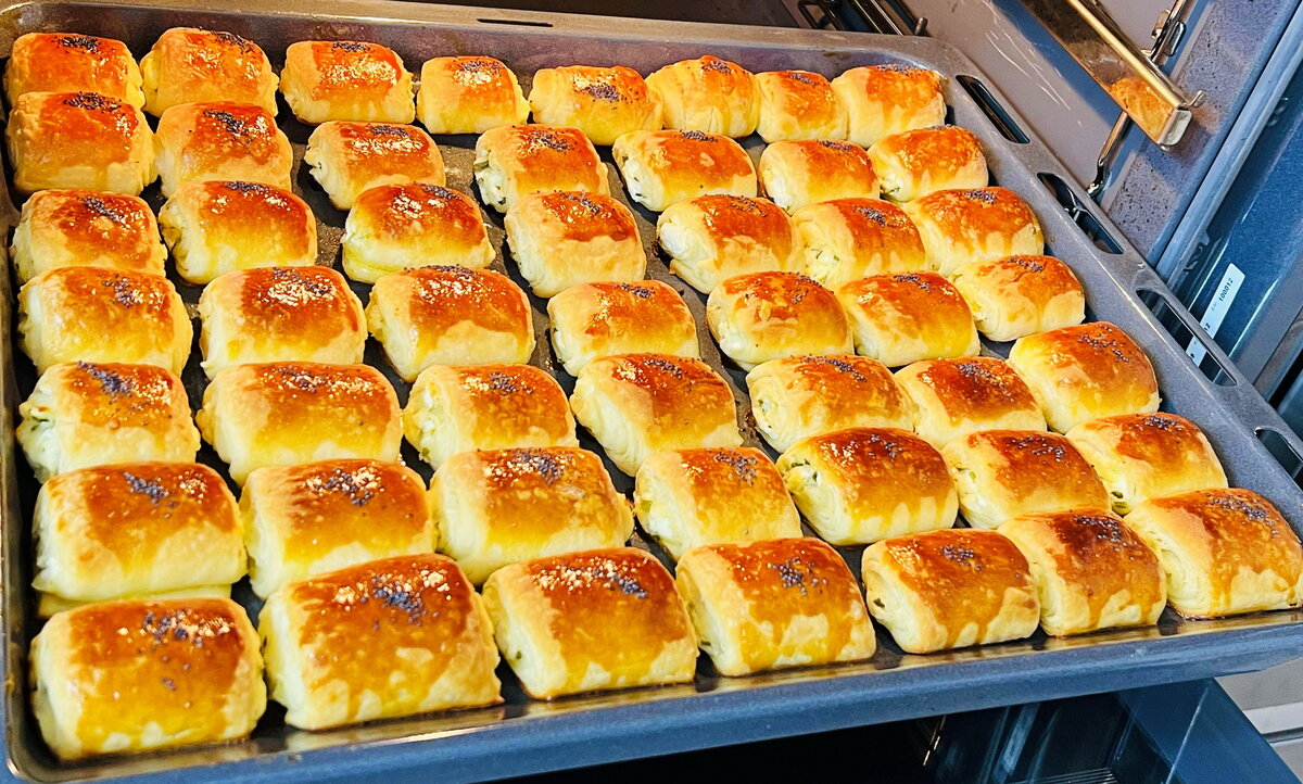 Переложите заготовки на противень, предварительно смазанный растительным маслом. Смажьте желтком и отправьте в разогретую духовку на 180 градусов на 20-25 минут. Выпечка готова, когда она приобретет золотистую корочку. Подавать можно горячей, и она точно станет хитом любого стола!