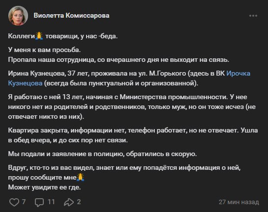 «Мы подали заявление в полицию, обратились в скорую. Вдруг, кто-то из вас видел, знает или ему попадётся информация о ней, прошу сообщите»,