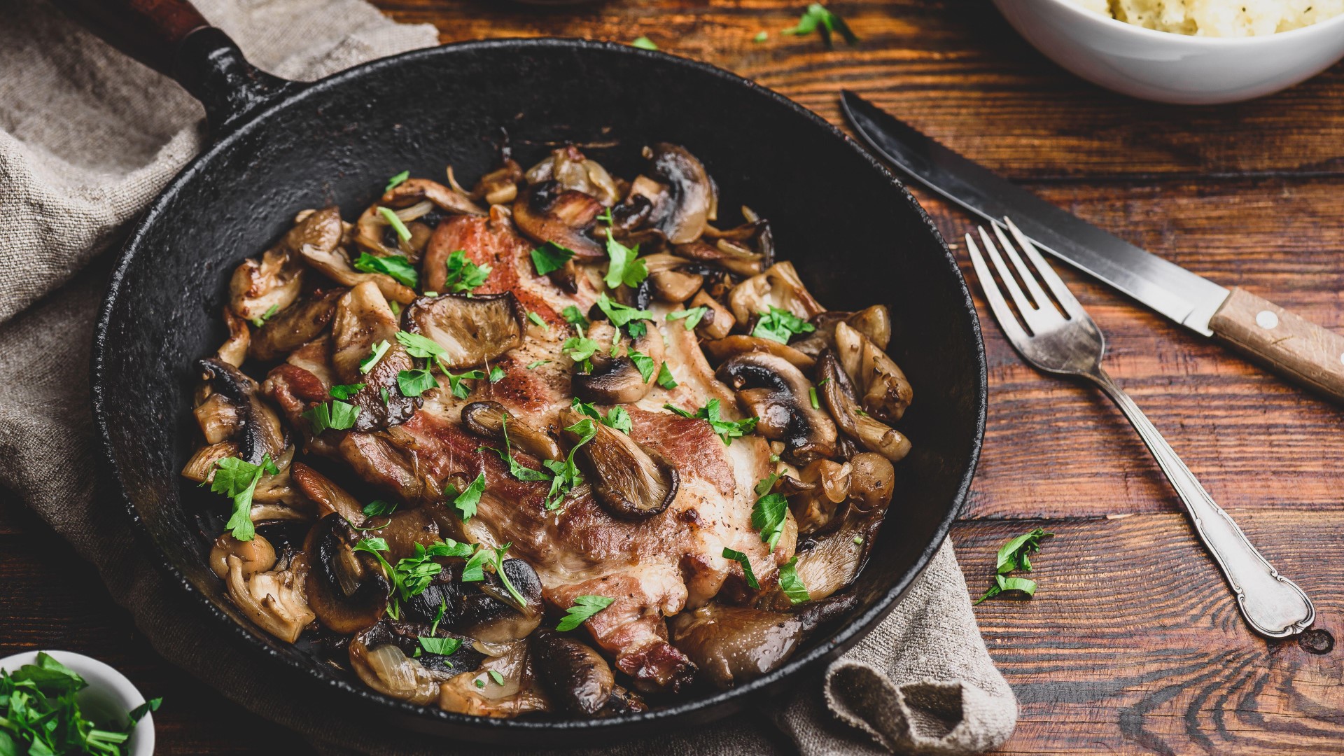 Мясо нарежьте кубиками и обжарьте на сковороде в течение 10 минут. Затем уберите свинину и в течение 10 минут обжаривайте только лук и грибы. Выключите огонь и верните мясо обратно.