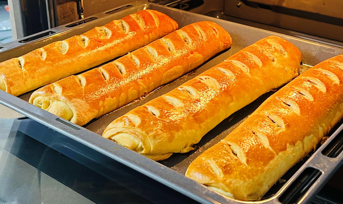 Когда тесто подойдет, его делят на четыре равные части. Каждую часть сворачивают в колобок и раскатывают в тонкий пласт. Затем следует смазать тесто размягчённым сливочным маслом и сложить его слоями. Получившийся пласт следует снова раскатать в прямоугольник, после чего выкладывают начинку с одного края и аккуратно заворачивают в рулет.