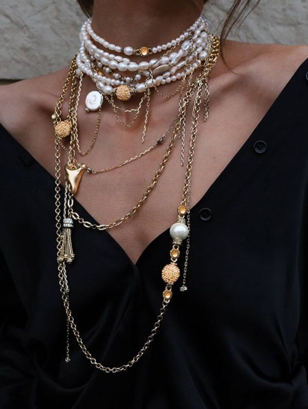 - Многослойность украшений: Смешение различных материалов и текстур в одном украшении — это новый тренд, украшающий шею долгожданными многослойными бусами и ожерельями. Здесь можно увидеть и ожерелья из кожи, и элементы из натуральных камней — такой эклектичный стиль станет отличным выбором для смелых модниц.