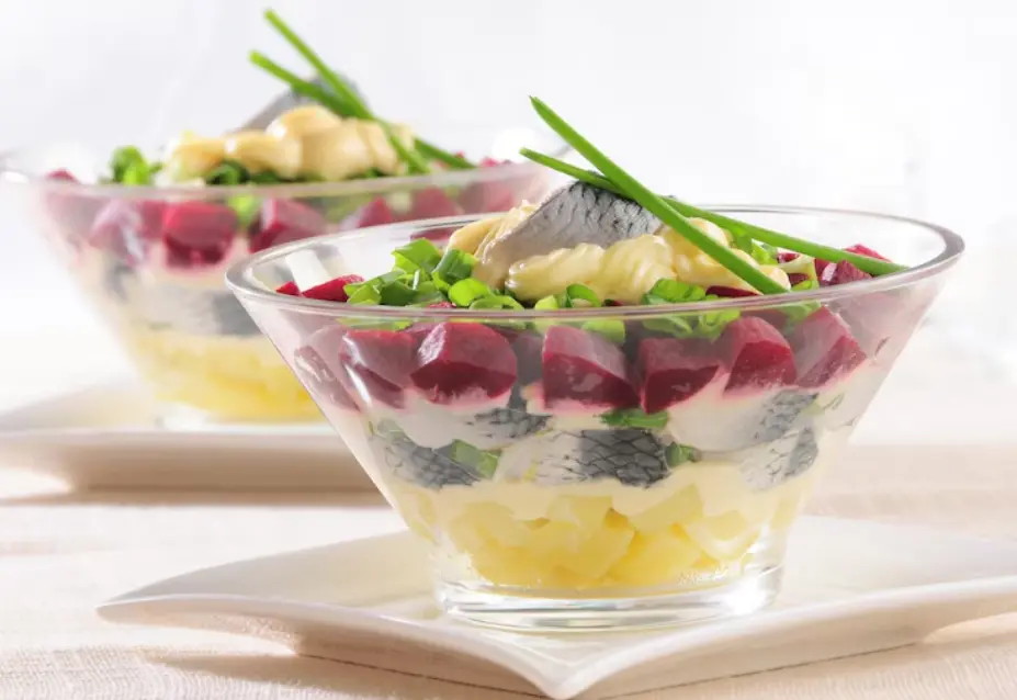 На дно салатницы выложите картошку, смажьте её майонезом и посыпьте зеленым луком и сельдереем. Затем уложите слой сельди, снова намажьте майонезом и посыпьте луком. Завершите слоем свеклы, смажьте и охладите перед подачей.