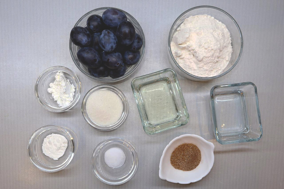 Тем временем можно заняться начинкой. Сливы моют, разрезают пополам, удаляют косточки и нарезают на дольки. Сахар смешивают с кукурузным крахмалом, чтобы начинки была более насыщенной.