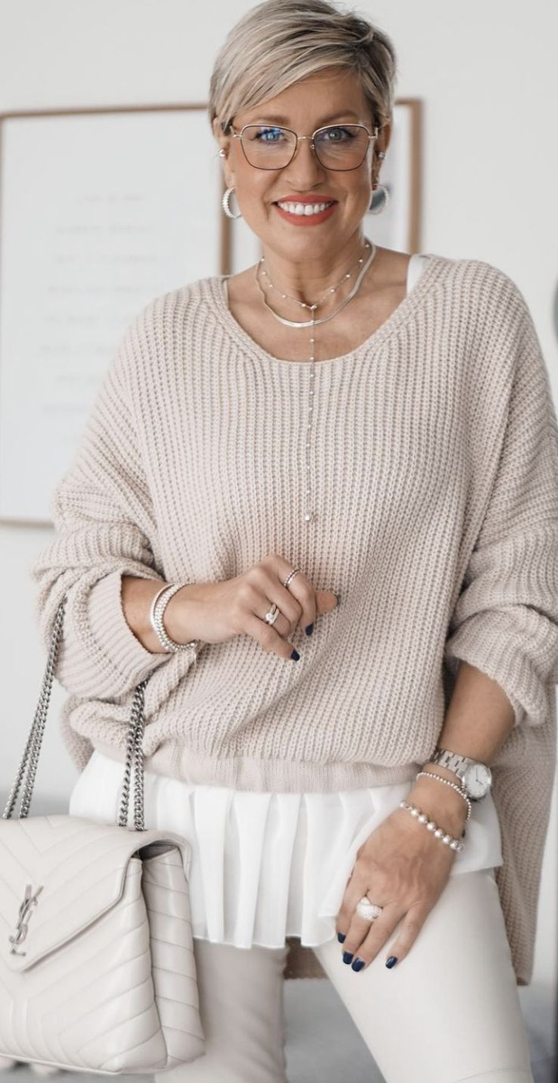 - Свитера. Нейтральные цвета, такие как серый, кремовый и темно-синий, станут отличным выбором. Интересные модели с косой вязкой или рельефной текстурой помогут создать уникальный образ.