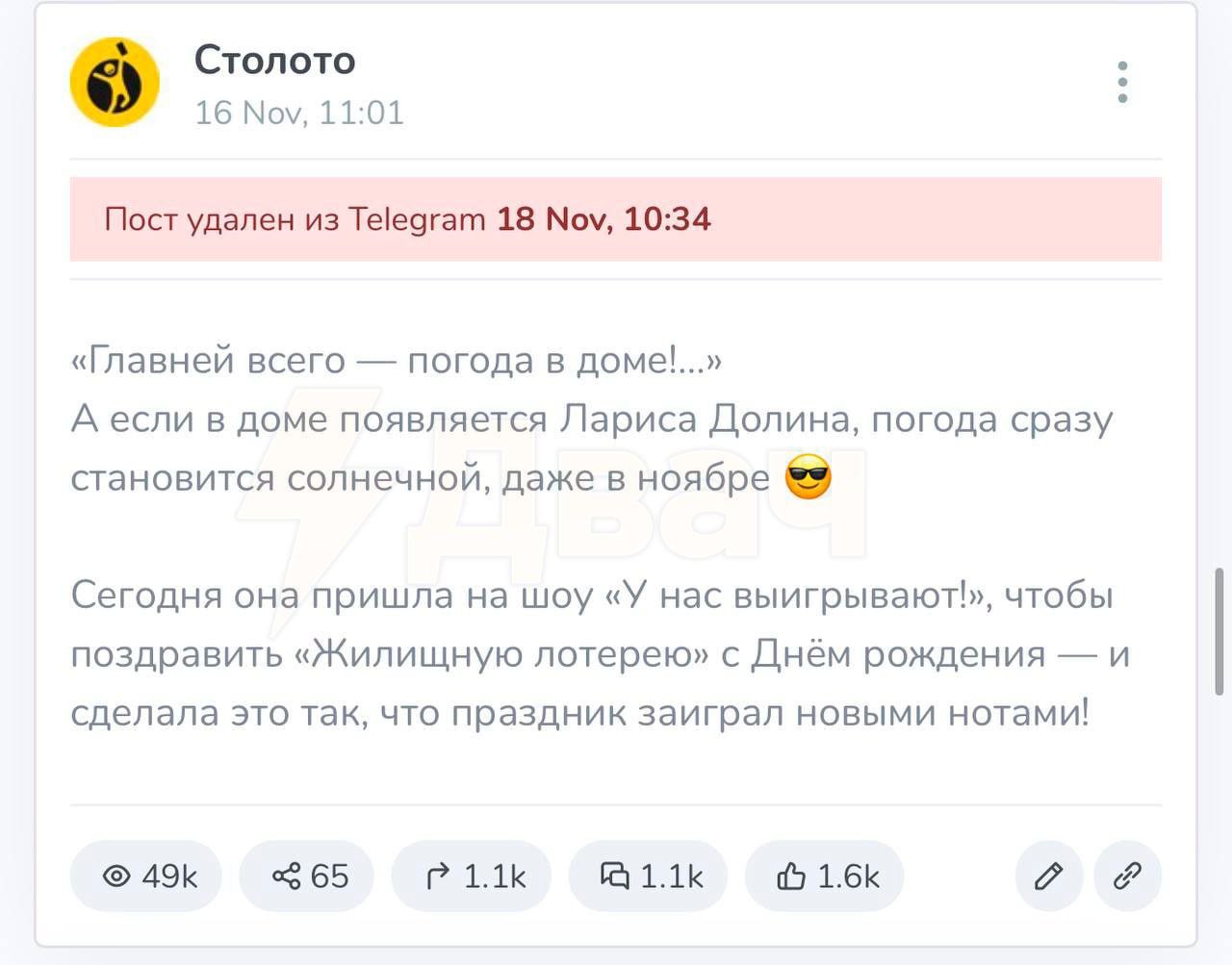 «Столото» удалили все посты с Ларисой Долиной, где она приглашала всех поучаствовать в «жилищной лотерее»