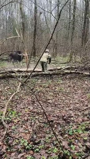 Лось запутался в проволоке, которая была натянута между деревьев. На помощь пришли сотрудники Калугаоблохоты.