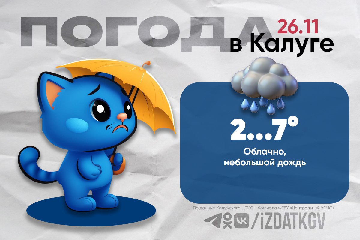 В среду, 26 ноября, жителей Калужской области ожидает облачная погода. В утренние и дневные часы возможны смешанные осадки в виде дождя со снегом.Температурный режим сохранится в пределах от +3 градусов утром до +6 градусов днем. Ветер...