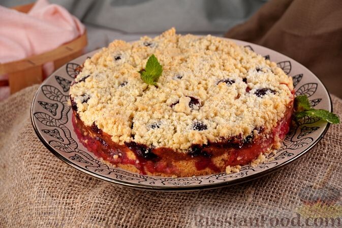 - Насыпной пирог с творогом и сливами. Этот десерт удивляет своей легкостью и насыщенным вкусом. Основа из песочной крошки пропитывается сочными сливами и легким творожным кремом.