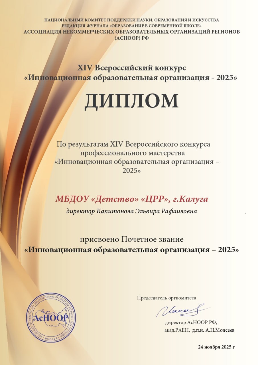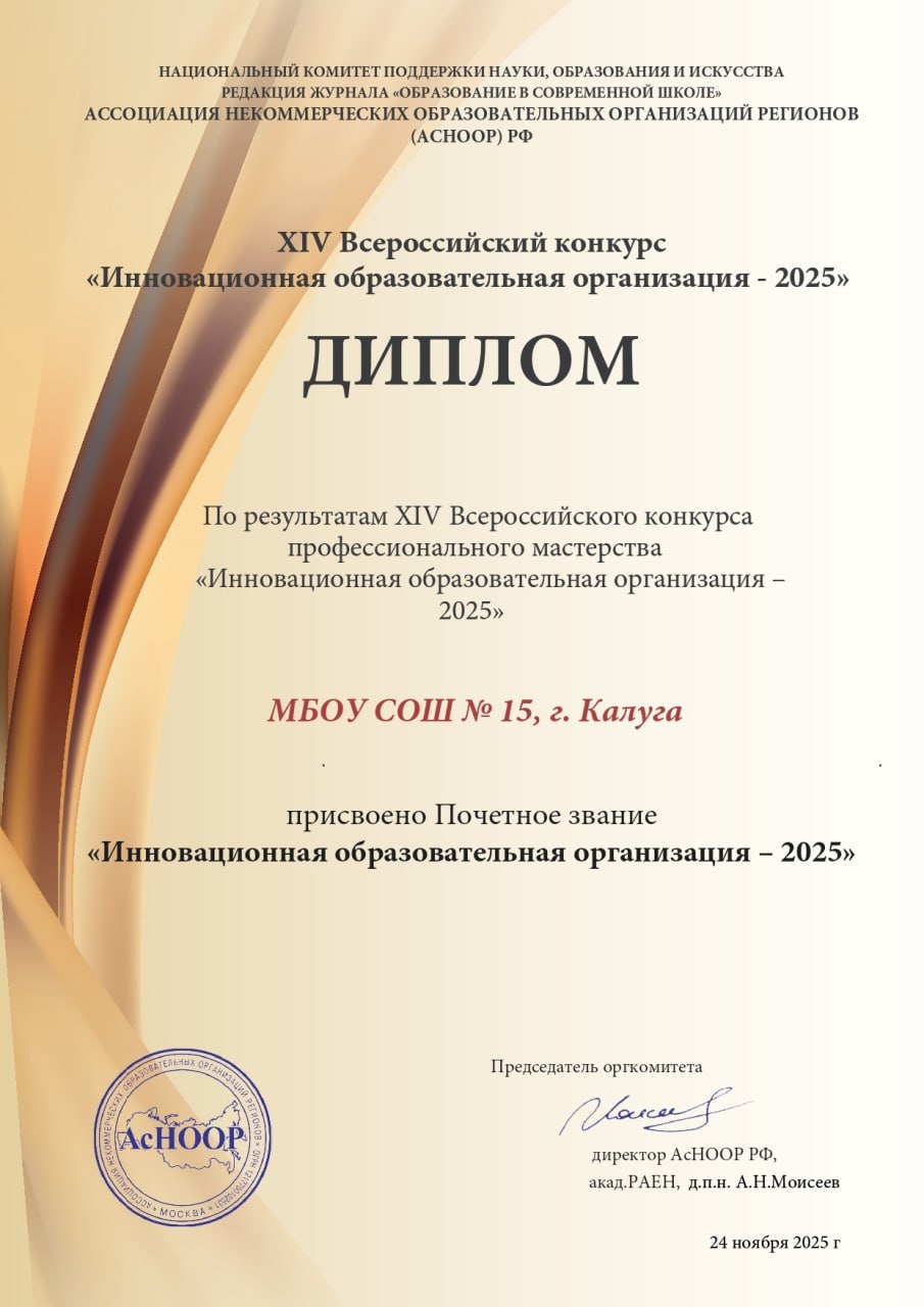 Калужская средняя школа № 15 заняла первое место на ХIV Всероссийском конкурсе профессионального мастерства «Инновационная образовательная организация - 2025» в номинации «Инновации в воспитании». Это учебное заведение также стало лауреатом еще в трех номинациях: «Инновации в воспитании», «Инновации в управлении», «Инновации в образовании». Калужский Центр развития ребенка «Детство» занял второе место в номинации «Инновации в образовании». Четыре его педагога стали лауреатами в этой же номинации. Лауреатом в номинации «Инновации в образовании» также стала педагог средней школы № 46.