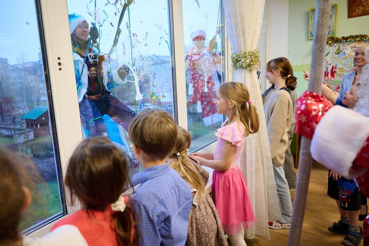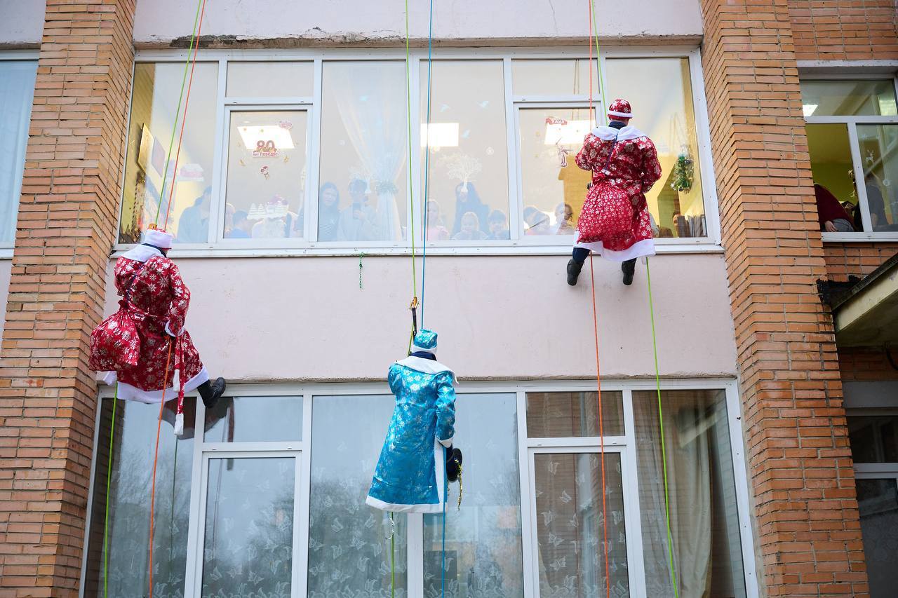 Студенты-спасатели, прошедшие перед этим специальную альпинистскую подготовку, спустились с крыши Обнинского центра социальной помощи семье и детям «Милосердие», чтобы поздравить детей, оставшихся без родителей, с наступающим Новым годом и вручить им подарки.