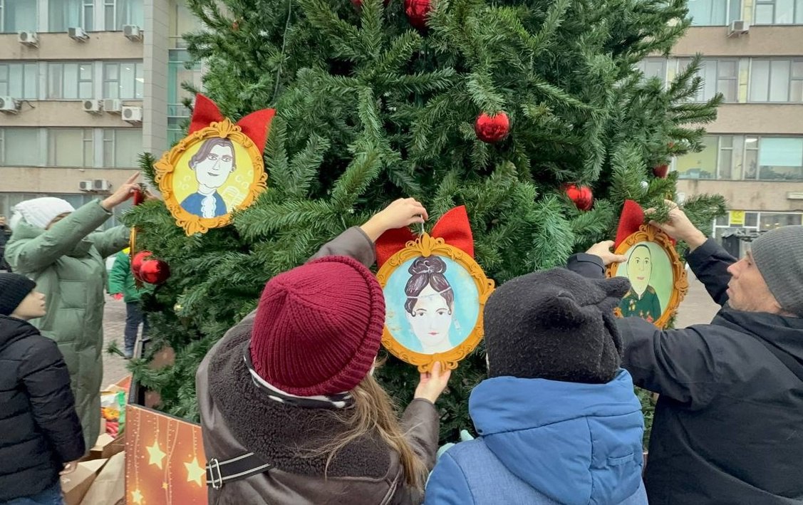 Возле здания городской администрации Калуги появилась необычная праздничная ёлка. Вместо стандартных шаров и фигурок её украсили портретами людей, чьи имена неразрывно связаны с историей края.