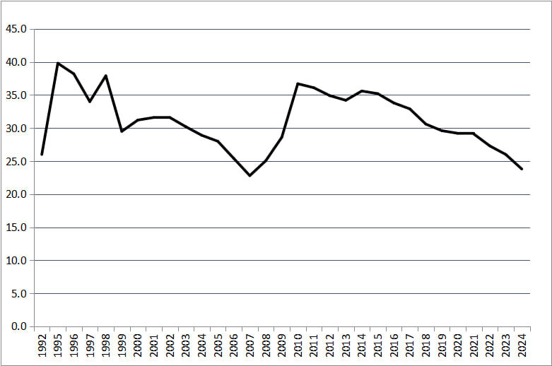 Анализ показывает, что с 1992 года коэффициент замещения демонстрировал разные тенденции: увеличение и снижение его уровня. Минимальная отметка была зафиксирована в 2007 году, когда соотношение составило 22,8%. С помощью валоризации и активной индексации в 2010 году коэффициент удалось поднять до 36,7%, но с 2015 по 2024 год наблюдалось постоянное снижение, и к 2024 году он упал до 23,8%.