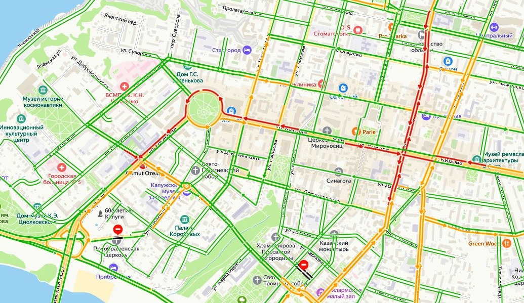 Образовавшаяся пробка растянулась на несколько улиц. Она охватила улицу Гагарина, сквер Мира, улицу Кирова и дошла до сквера Медсестёр.