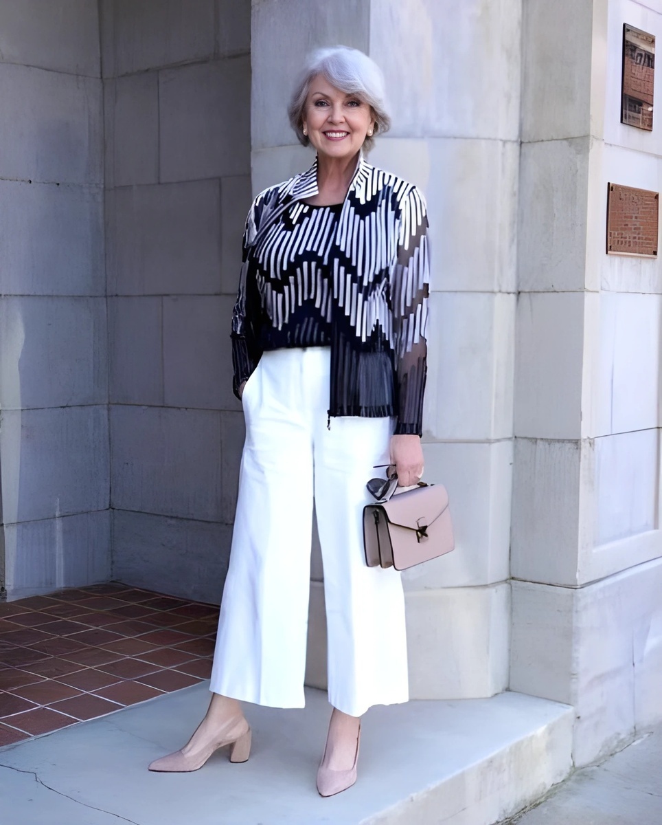 - Элегантная классика: Широкие брюки белоснежного цвета длиной до щиколоток в сочетании с темным верхом создают утонченный и стильный образ. Заправленная блузка акцентирует внимание на талии, а полупрозрачная рубашка помогает скрыть возрастные изменения на шее и руках.