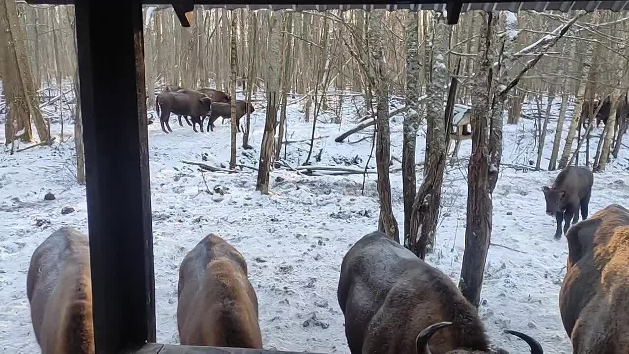 Так сейчас выглядит смотровая площадка «Коробовская» в заповеднике «Калужские засеки». Зубры вовсю приходят на подкормочные и как никогда рады видеть инспекторов охраны: именно они привозят корм и ведут саму подкормку.