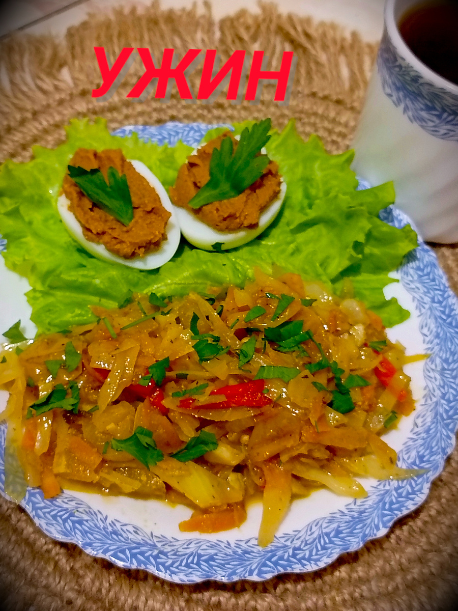 При подаче этого овощного рагу на тарелке был использован свежий лист салата в качестве подложки. Для завершения этого кулинарного шедевра к блюду добавили вареное яйцо, на которое был аккуратно намазан домашний печеночный паштет. Чтобы вечер стал поистине уютным, был заварен свежий чай с легкими нотками бергамота — идеальное завершение насыщенного дня.