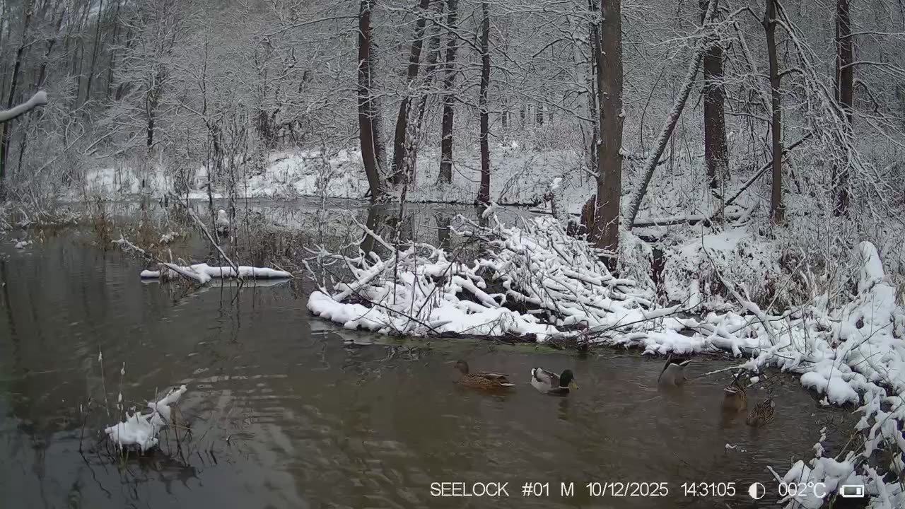 Птиц запечатлела фотоловушка заповедника «Калужские засеки». Небольшая стайка диких уток нырятет вниз головой, чтобы достать пищу со дна мелких водоемов: растения, моллюсков и прочее.