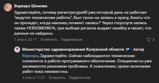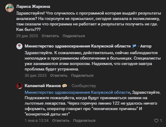 Уже второй день жители Калужской области возмущаются из-за сбоя в работе «Регистратуры40», Госуслуг. Люди не могут получить льготные лекарства, результаты анализов и т.д. В министерстве здравоохранения региона говорят, что у них технические сложности с программой, через которую в аптеках выдают лекарства. Решать эту проблему будут несколько дней.