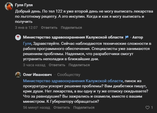 В «КГВ» обратился диабетик, который сейчас не может получить инсулин из-за проблем с программой. Дело еще в том, что купить инсулин он не может сам, так как для этого нужен рецепт, который никто не может сейчас дать. При этом мужчина до новогодних пытался самостоятельно получить рецепт на инсулин, но ему отказали в выдачи, заверив, что «на январских всё будет работать». В итоге калужанин уже морально готовится попасть завтра в реанимацию...